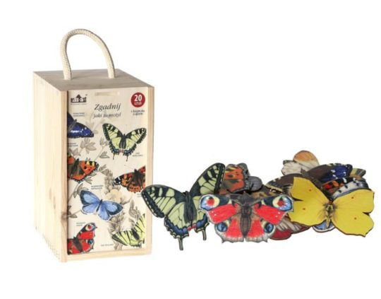 Zestaw zapakowany jest w elegancką drewnianą skrzynkę i zawiera książeczkę z krótkim opisem każdego motyla, która pomoże w łatwym rozpoznawaniu poszczególnych motyli. To doskonała zabawa edukacyjna dla dzieci i dorosłych, która rozwesela, a jednocześnie pozwala zgłębiać wiedzę o przyrodzie.