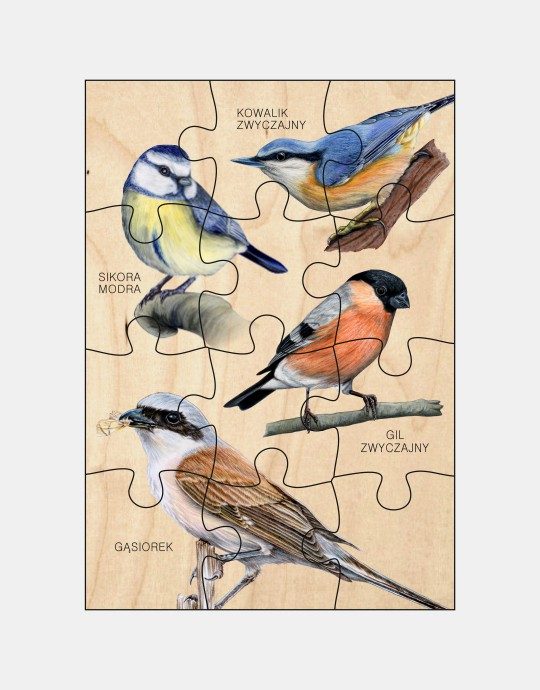 Puzzle drewniane dla dzieci z rysunkami ptaków. Zapraszają malucha na podniebną wycieczkę w towarzystwie zwinnego Gąsiorka i czerwonobrzuchego Gila. Zapoznają go z uroczą sikorką modrą oraz nadrzewnym akrobatą, kowalikiem.